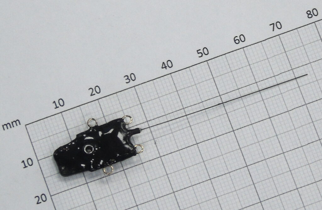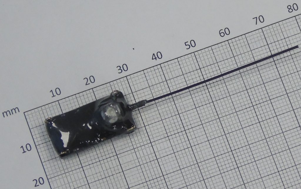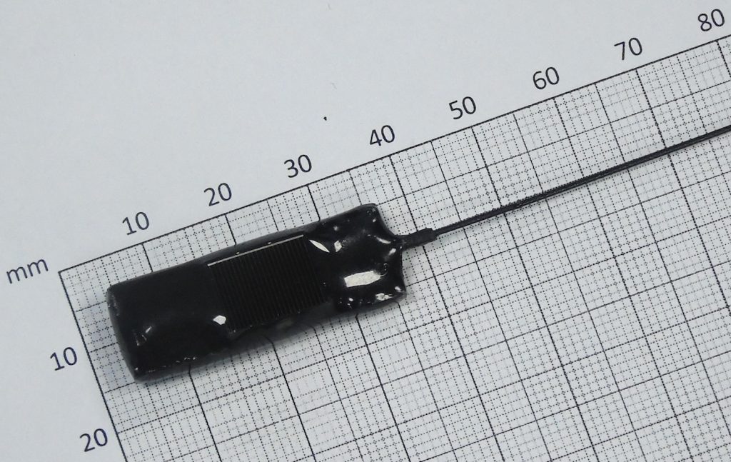A picoFix® 2.6g GPS, depth with UHF download tag. This tag has been successfully deployed on diving petrels. It measures 34×12.5x8mm plus ~50mm external whip antenna. On battery alone it can provide up to 700 GPS location attempts including regular UHF download attempts, but with no depth data. See Table A for illustrations of the impact depth data transmission would have on the battery capacity of this tag (excluding solar). This tag utilises our new solarPlus technology and therefore can provide up to 360 GPS location attempts per day in UK summertime conditions. The daily volume of depth data to be wirelessly transmitted will impact this capacity – please contact us for more details. This tag is depth proof to 30m.